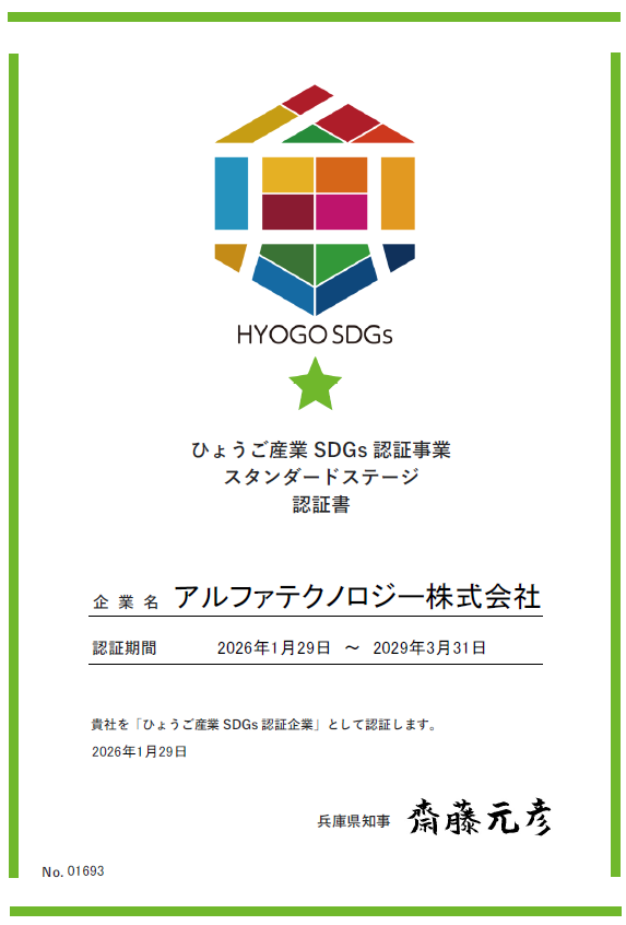 この度、アルファテクノロジー株式会社は、兵庫県から「ひょうご産業SDGs認証企業 スタンダードステージ」として認証を頂きました。 「ひょうご産業SDGs認証事業」とは、「ひょうご産業SDGs推進宣言事業」に登録している県内中小企業等の中から、一定の要件を満たす企業等を兵庫県が評価・認証する事業です。 ※2026年2月時点、宣言企業は5,805社、その中で認証企業は445社のみとなります。 今後も、持続可能な未来の実現に向けて、社員一同さらなる取り組みを進めて参ります。